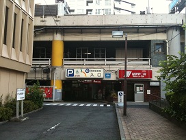 ② 高速道路の高架橋の手前の道を左に曲がると、すぐ右側に「兜町駐車場」の入口が見えます。
