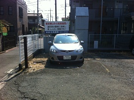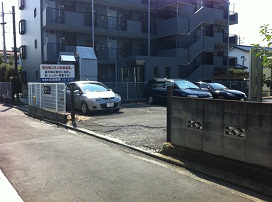 ③ 右手がブロック塀の駐車場が見えてきます。