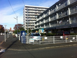 ③ 右手に鉄柵フェンスの駐車場が見えてきます。