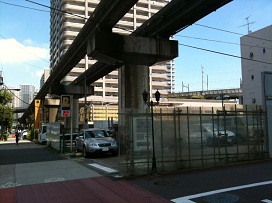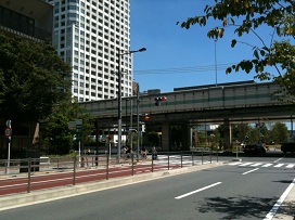 ② 写真の「港南小学校前」交差点を左折。海岸通り(モノレール沿い)を新橋方面へ進む。 |