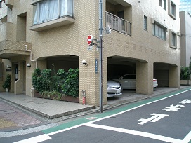 ③ カーブを曲がって1つ目の角のマンションの1階の駐車場です。