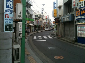① 菊名駅東口を出て、前面の道路を左折します。