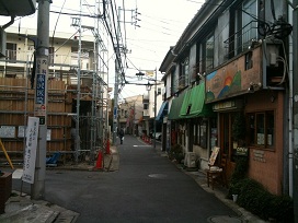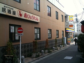 ① 北口を出て商店街を北上し、「赤ひょうたん」の角を右に曲がります。