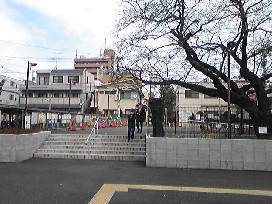 ① 北口を出て正面の階段を上がり、駐車場を通り抜けて路地に出ます。