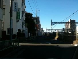 ② 線路を横断する跨線橋が見えたら、その手前の路地を左方向に進みます。