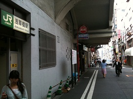 ① 「西口」からJR高架線に沿って戻る方向、浅草橋駅西口交差点方向に進みます。 |