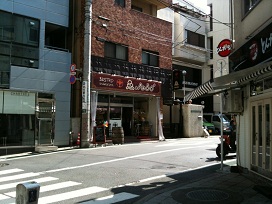 ② 玉川通りから200m程先の赤いレンガ色のビルを右に曲がる。