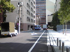 ② 150mくらい先の公園と公園の間の道を右に曲がる。