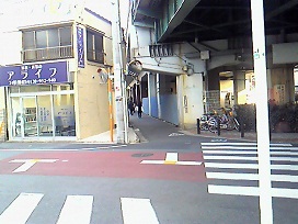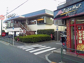 ③ 高架下から約150m進んだT字路を右へ曲がる。「ピザハット」と「ファミリーレストラン」の間の道です。