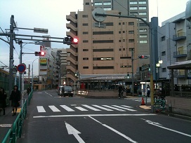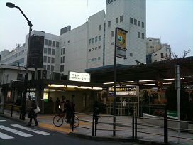 ① 「東口」を出て、線路通り沿いを新宿方面へ。