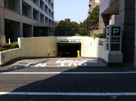 ③ 駐車場スロープの左側にある階段を下りて駐車場へ。目印は「目白中野ビル」階段付近の「駐車場入口 管理事務室」プレート。