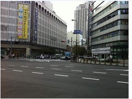 ① 「西口」から「西口五差路」交差点を右に曲がり、劇場通りを北上。