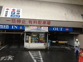 ③ サンスクエアを左側から裏手に回った駐車場入口か、建物内部の階段から地下(BF)へ降り、駐車場奥へ進みます。