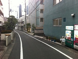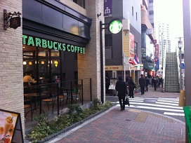 ② 歩道橋の手前の路地を左折。(角にスターバックスコーヒーがあります。)