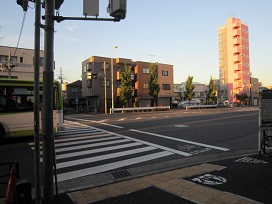 ① 「1番」出口を出て、すぐの信号交差点をダイビングスクール側に渡り、右方向へ進みます。