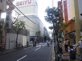 ① 「北口A」出口を上がり、茶沢通り(写真の西友がある通り)を右に曲がる。
