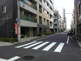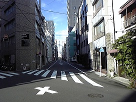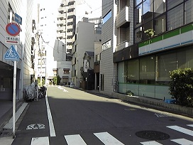 ① B1出口エレベーターにて地上へ出て、最初の角を右へ。