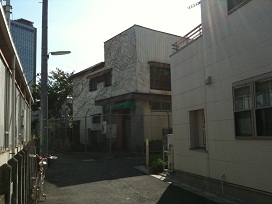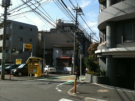 ② 「太子堂4丁目交差点」を越え、50m程先のコインパーキングを右折、すぐ道が分かれるので右側(一方通行道路)の通りに入る。