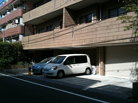 ③ 100m程進むと、右側のマンションに駐車場がございます。