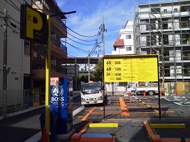 ③ マンション下を出て道路を右方向へ進み、すぐコインパーキング「Mr.P」線路側に併設されている月極駐車場となります。