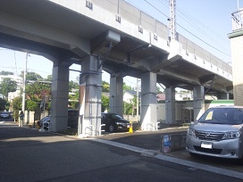 ② 1つ目の信号を渡り、東急大井町線高架手前を右折、高架に沿って直進します。