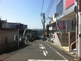 ① 西口を出て左方向に進み、一番左、線路沿いの道を進みます。