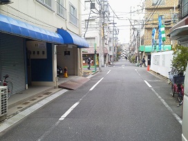 ③ 左手の青い屋根があるマンション下駐車場となります。