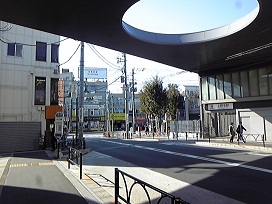 ① 「正面口」を出て左へ進み、「上野毛駅前交差点」を右へ進みます。