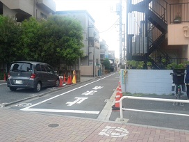 ③ 幼稚園が角にあるT字路を右に曲がり、左側のマンション駐車場となります。