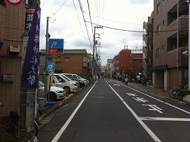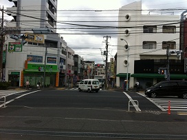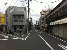 ① 改札口を出て明治通りを横断。二つ目の路地を右に曲がり、道なりにまっすぐ進みます。(目印は交差点左角のミニストップ)