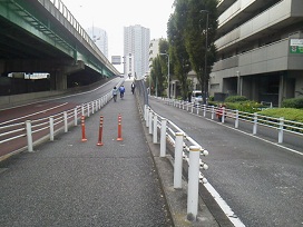 ② 朝潮大橋を渡り、月島運動公園を右手に見ながら、道なりに進みます。