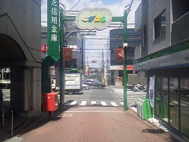 ① 改札を出て右へ。商店街を進み、1つ目の信号を右へ曲がります。