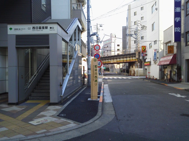① 日暮里舎人ライナー「西日暮里駅」下車。東口を出て後方の通りを進み、1つ目の路地を左へ。