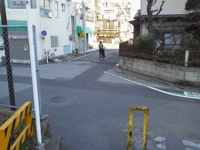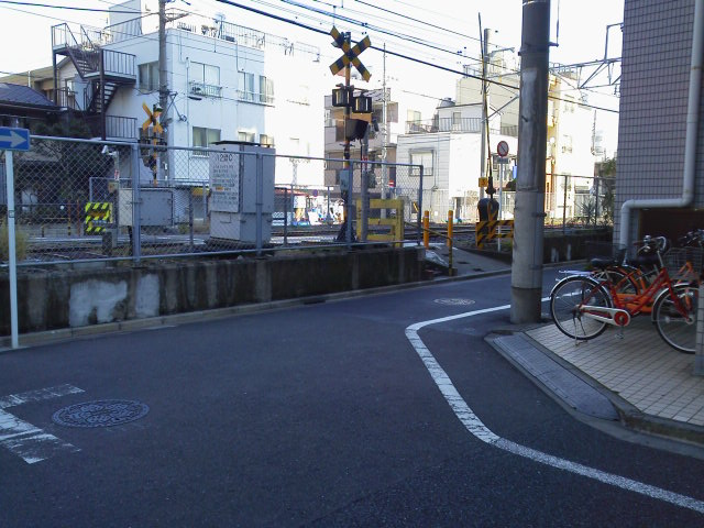 ② 70メートル程直進。突き当りのT字路を右へ曲がり、左側の踏切を渡ります。