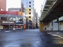 ① JR「両国駅」西口を出ます。高架下の信号を渡り「マクドナルド」裏の通りを左に曲がります。 |