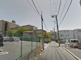 ② ロータリーに沿って右側へ。マンション角を折れ、前方の横断歩道を渡ります。