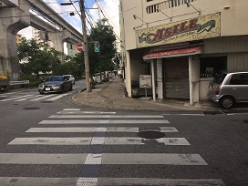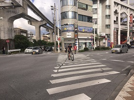 ② ゆいレール高架に沿って「牧志駅」方面に350メートル程直進。最初の信号を渡り、右に曲がります。