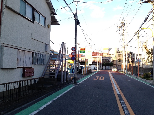 ① 「等々力駅」を出て目の前の十字路を右へ進みます。