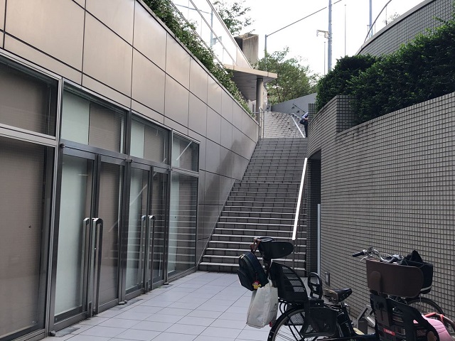 ② 区民ホール右側の階段を上ります。