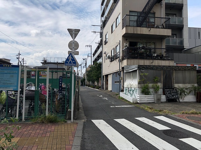 ② 歩道橋を越え、1つ目の路地を左へ曲がります。