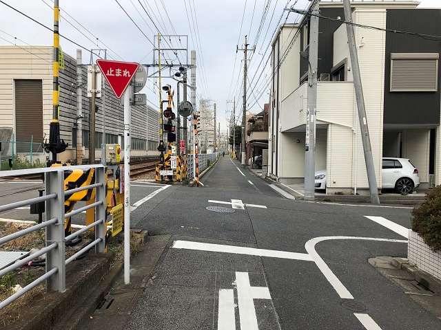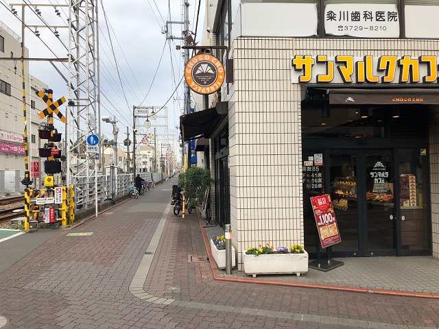 ① 「御嶽山駅」蒲田方面のりば出口を出て、正面の線路沿いの路地を進みます。