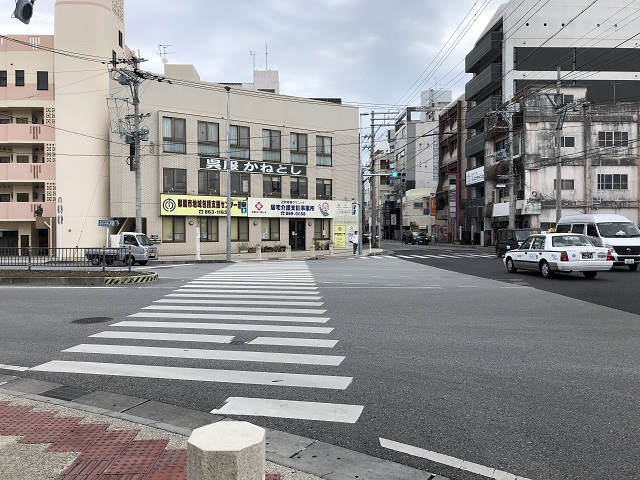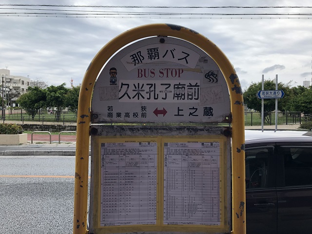 ① 「久米郵便局前」バス停から泊港方面へ進みます。