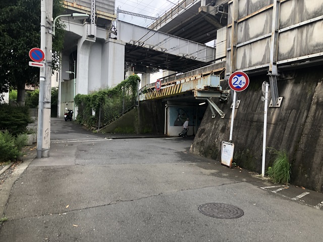 ① 「下神明駅」改札を出て左へ進みます。突き当りを左折し、ガード下をくぐります。