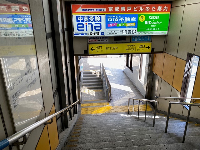 ① 「青砥駅」改札を出て左に進み、階段を下りて右側に出ます。 |