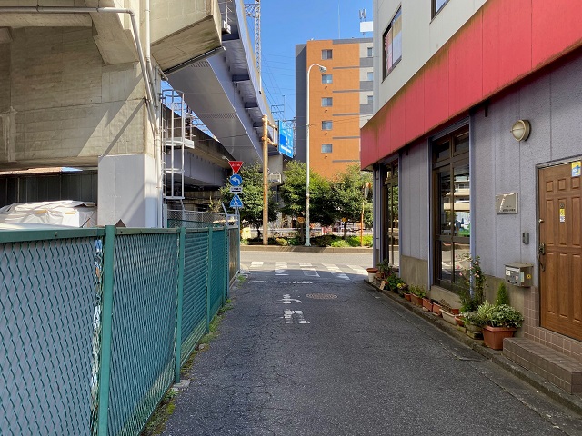 ⑤ 横断歩道を渡ったら右に進み、環七の高架下の側道を進みます。 |