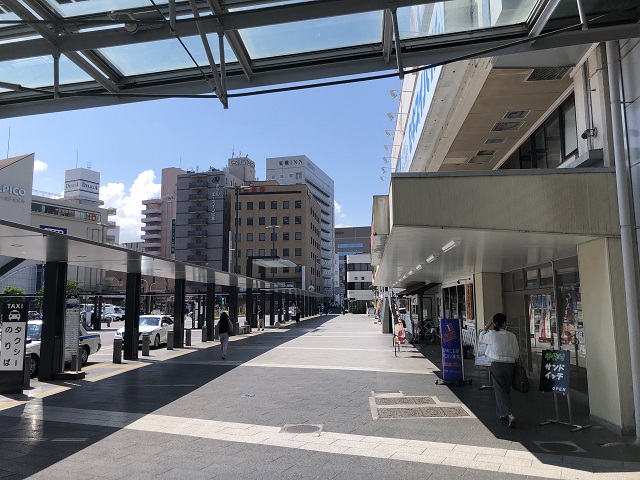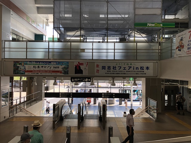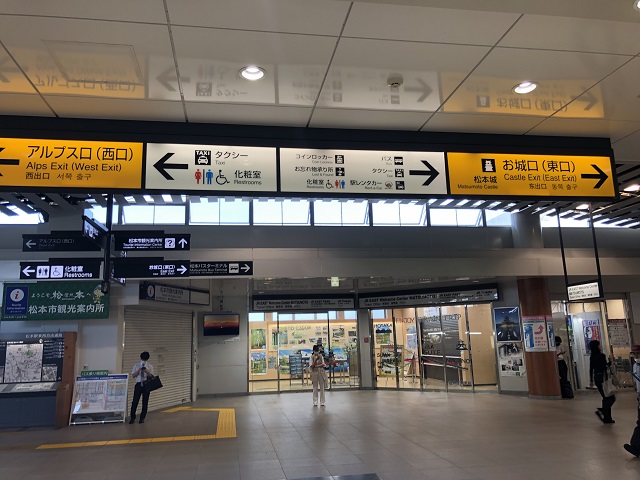 ① JR「松本駅」改札口を出て右側のお城口(東口)方面へ進みます。