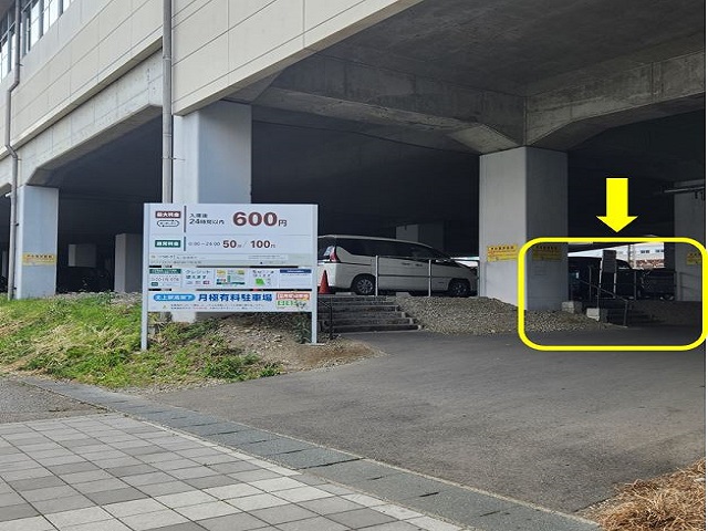 ④ 右手に「北上駅高架下月極駐車場」が見えたら、手前から2番目の階段を登り50m程直進します。