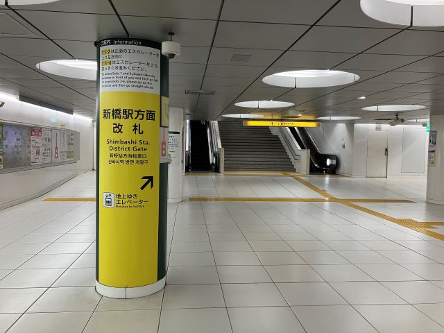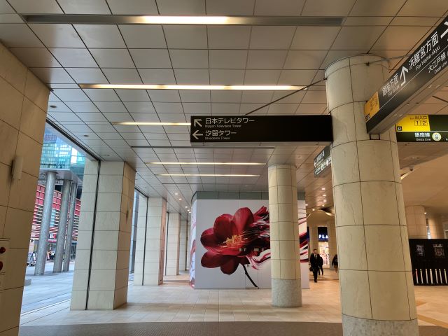 ① 都営大江戸線「汐留駅」新橋駅方面改札を出て目の前のエスカレーターでB2へ上がり、左手へお進みください。 |