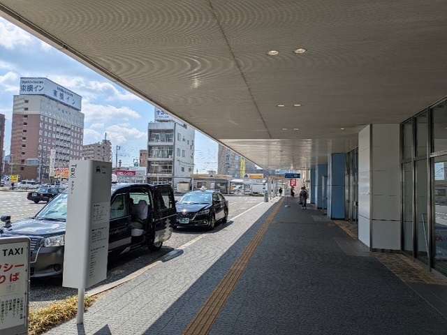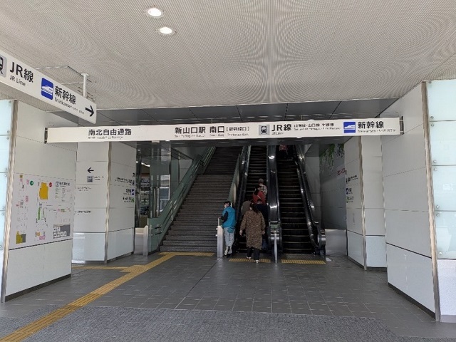 ① 新山口駅南口を降りて右折してください。