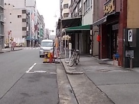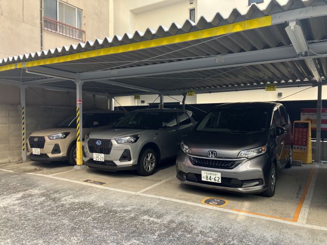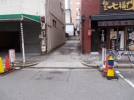 ③ 右手側の広いコインパーキングを過ぎたらビルとビルの間に細い通路があり奥に駐車場があります。奥に進むと左右に分かれてカーシェアがあります。駐車場左手側の黄色いエリアです。 |